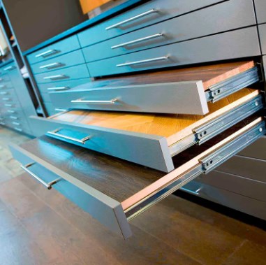 서랍 슬라이드는 서랍이 열리고 부드럽고 부드럽게 닫는 지 여부를 결정합니다. 고품질 슬라이드에는 일반적으로 3 단 디자인이 특징이므로 서랍이 쉽게 접근 할 수 있도록 서랍이 완전히 확장 될 수 있습니다. 이들은 일반적으로 강화 된 부식 저항을 위해 전기 도금 또는 스프레이 코팅 된 표면이있는 콜드 롤 스틸로 구성됩니다. 댐핑 또는 리바운드 기능이있는 슬라이드도 인기가 있습니다. 댐핑 슬라이드는 서랍이 부드럽게 닫히도록하여 꼬집음을 방지합니다. 리바운드 슬라이드는 서랍 패널의 라이트 프레스로 자동으로 튀어 나와 핸들 설치가 필요하지 않으며 캐비닛의 깨끗한 모양을 향상시킵니다.